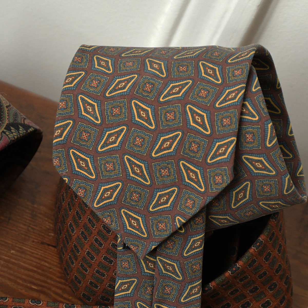 Une belle cravate dans les tons marrons composée de petits motifs géométriques bleus, beiges et oranges. Fabriquée en 100% soie, elle a une texture délicate avec une finition plutôt mate. Les teintes marrons et beiges en font une cravate polyvalente qui se porte lors de diverses occasions et avec différentes couleurs telles que du bleu marine, du gris ou encore du marron.