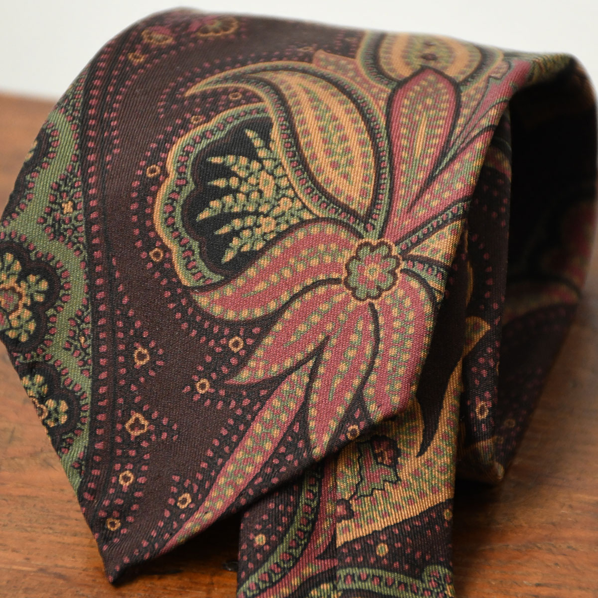 Une belle cravate à fond bordeaux composée d’imposants motifs Paisley beige, framboise et vert. Fabriquée dans un mélange de laine et de soie, elle a une texture délicate avec une finition légèrement soyeuse. Le bordeaux, associé au beige, en fait une cravate polyvalente qui se porte lors de diverses occasions et avec différentes couleurs telles que du bleu marine, du gris ou encore du marron.