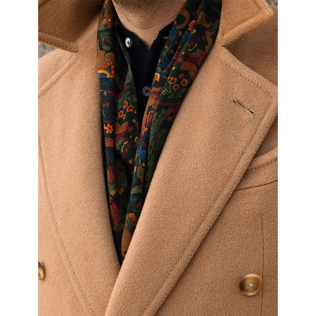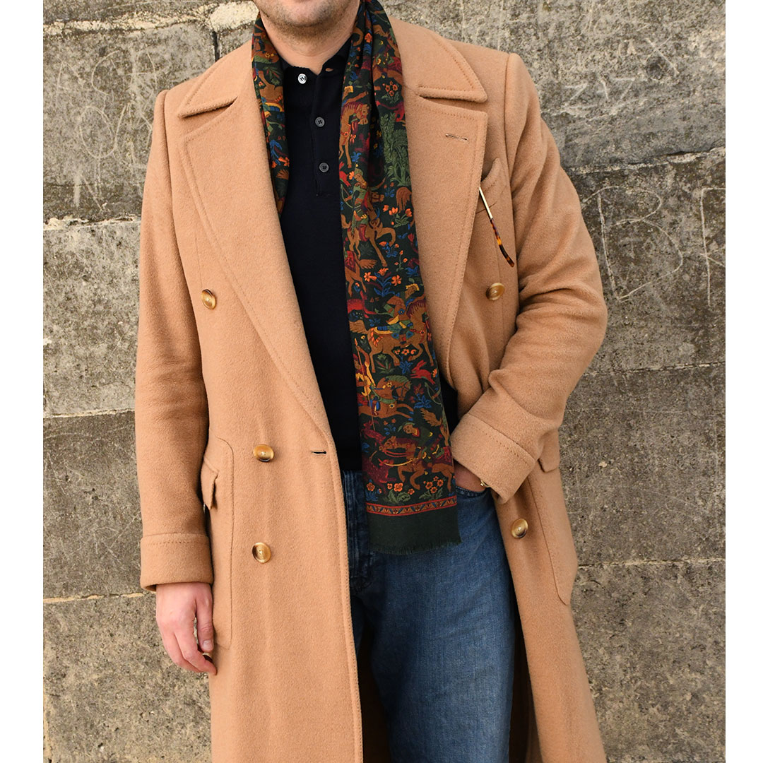 Écharpe en laine imprimée représentant des scènes de chasse de l’Empire Mongol, un Empire historique indien réputé pour son riche patrimoine culturel, artistique et architectural. Les motifs incluent souvent des éléments tels que des chasseurs, des animaux, la nature et des paysages associés à la chasse. Popularisées dans les années 80, les impressions de chasse mongol “Mughal Hunter” ont été observées sur des écharpes mêlant souvent des couleurs sombres et audacieuses.