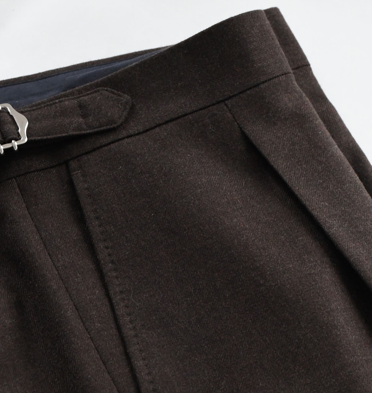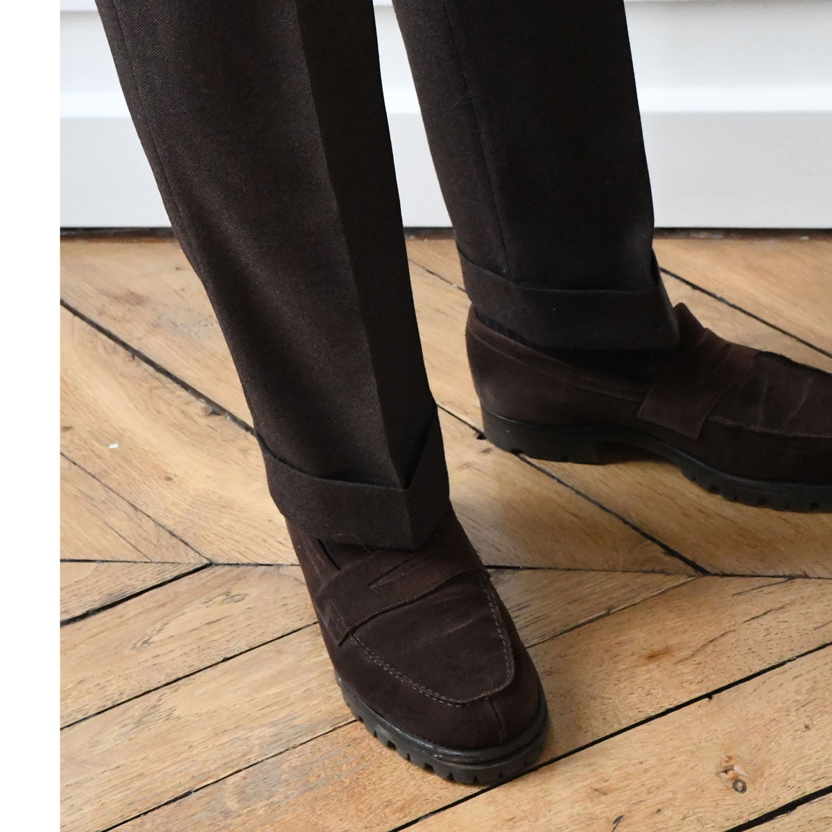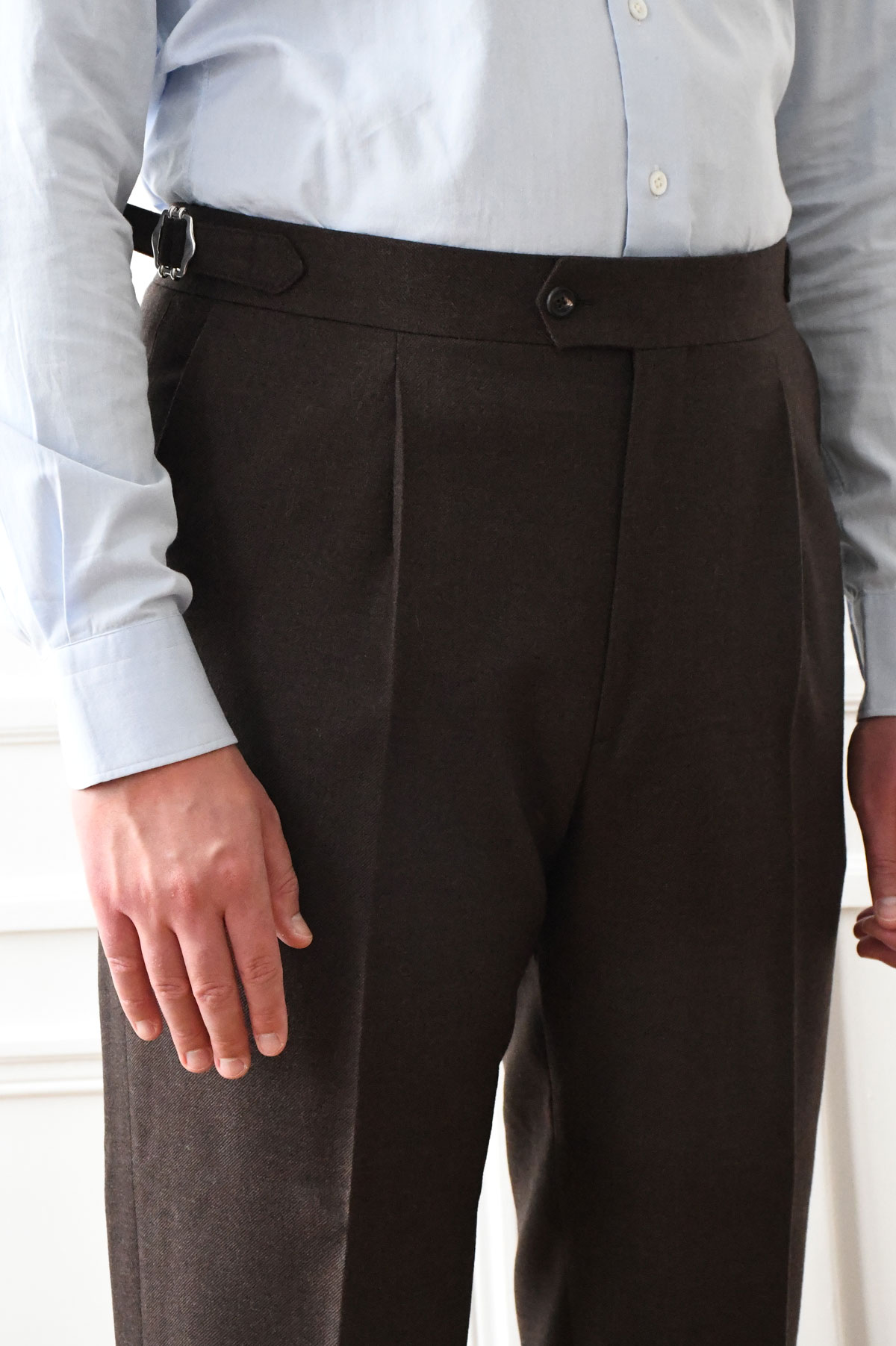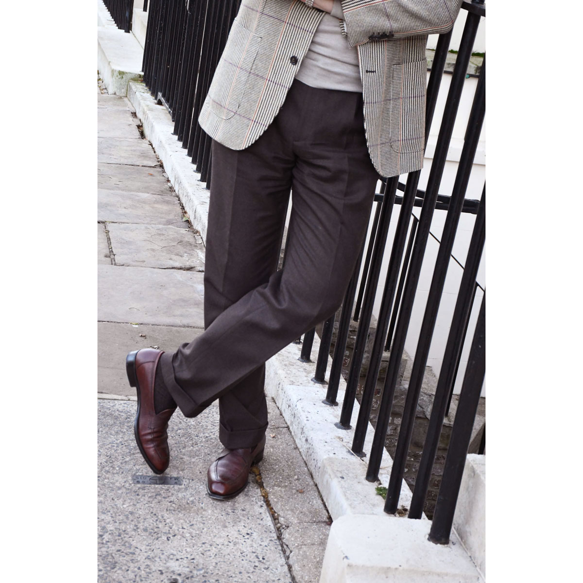 Le tissu le plus solide et le plus polyvalent pour un pantalon habillé est le Cavalry Twill. Fondé en 1885 par John William Standeven et Sam Earnshaw, le Cavalry Twill marron de chez Standeven s’associe bien avec le blanc crème, les gris beiges et le bleu marine comme avec des couleurs plus vives, comme le rose et l’orange par exemple.
