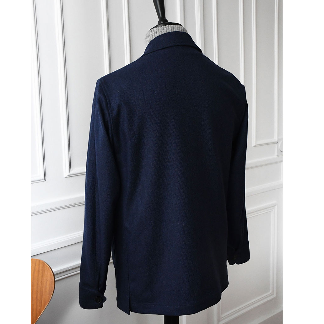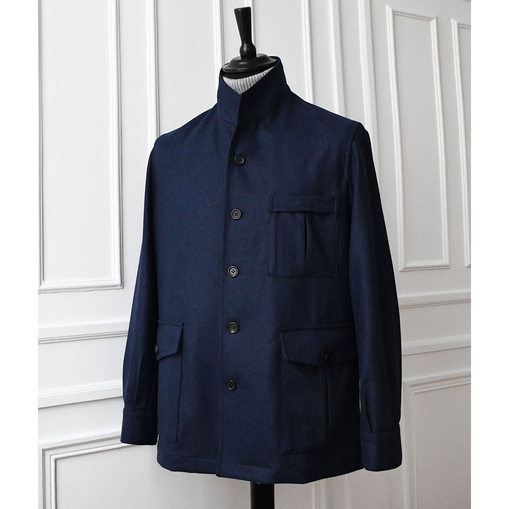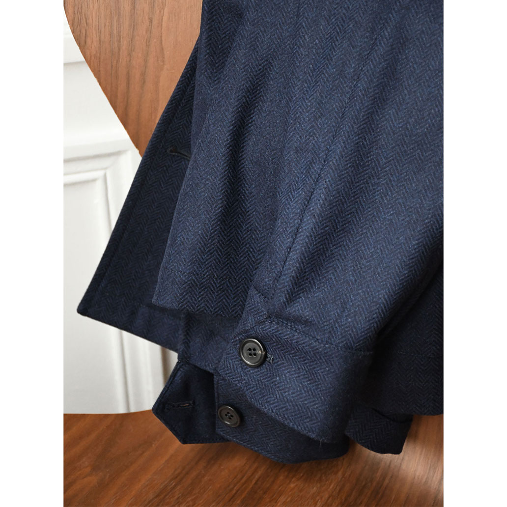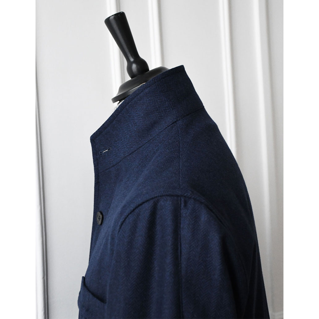 La veste coupe Teba puise son origine dans la tradition espagnole, où elle était portée comme veste de chasse. Elle se distingue par ses deux grandes poches plaquées, offrant un volume de rangement généreux, ainsi qu’une poche poitrine discrètement adaptée au téléphone. Son col modulable permet deux expressions distinctes : porté ouvert, il dessine une encolure en V souple et décontractée ou fermé entièrement, il enveloppe le cou et offre une protection supplémentaire contre le froid. Le tissu est issu de la liasse Drapers Opalis. Cette flanelle douce au motif chevron présente une texture subtile et un toucher particulièrement agréable. Avec un poids de 310 g, elle offre une belle tenue tout en conservant souplesse et confort. Non doublée, la veste reste légère et respirante. Polyvalente, elle se porte aussi bien sur un t-shirt ou pull que sur une chemise.