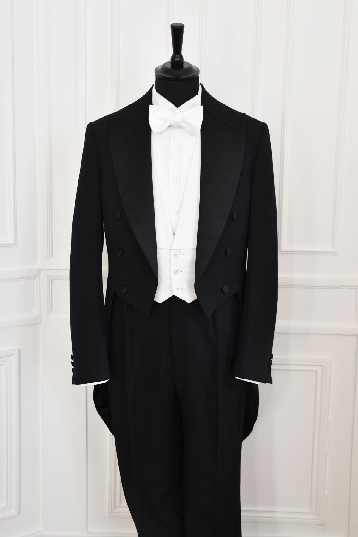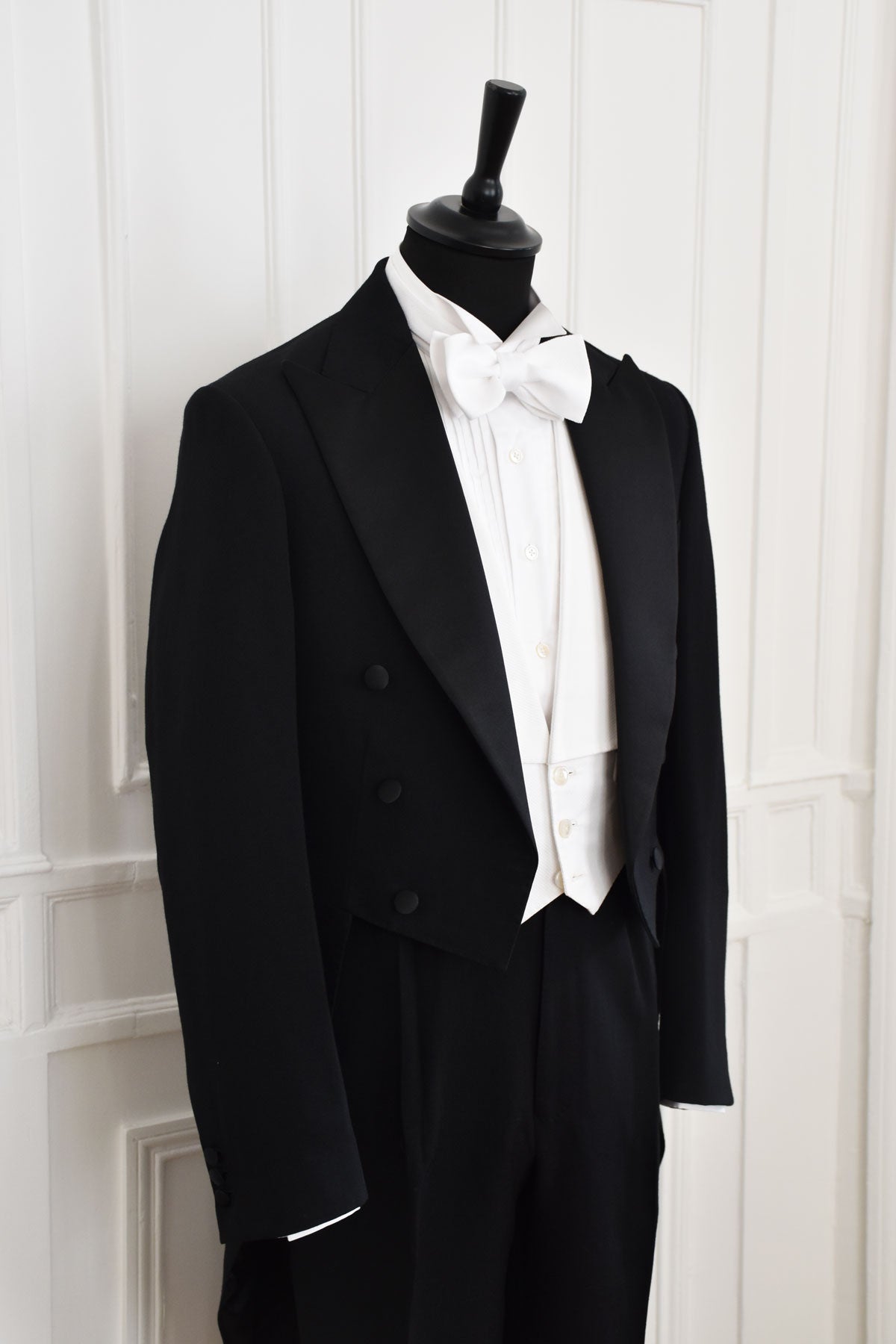This ceremonial attire can be called by different names: tailcoat, white tie, or evening dress. The tailcoat, now even rarer than the morning coat, is the most formal attire for a wedding. Its black and white appearance is highly codified and particularly suitable for weddings with a very formal protocol.