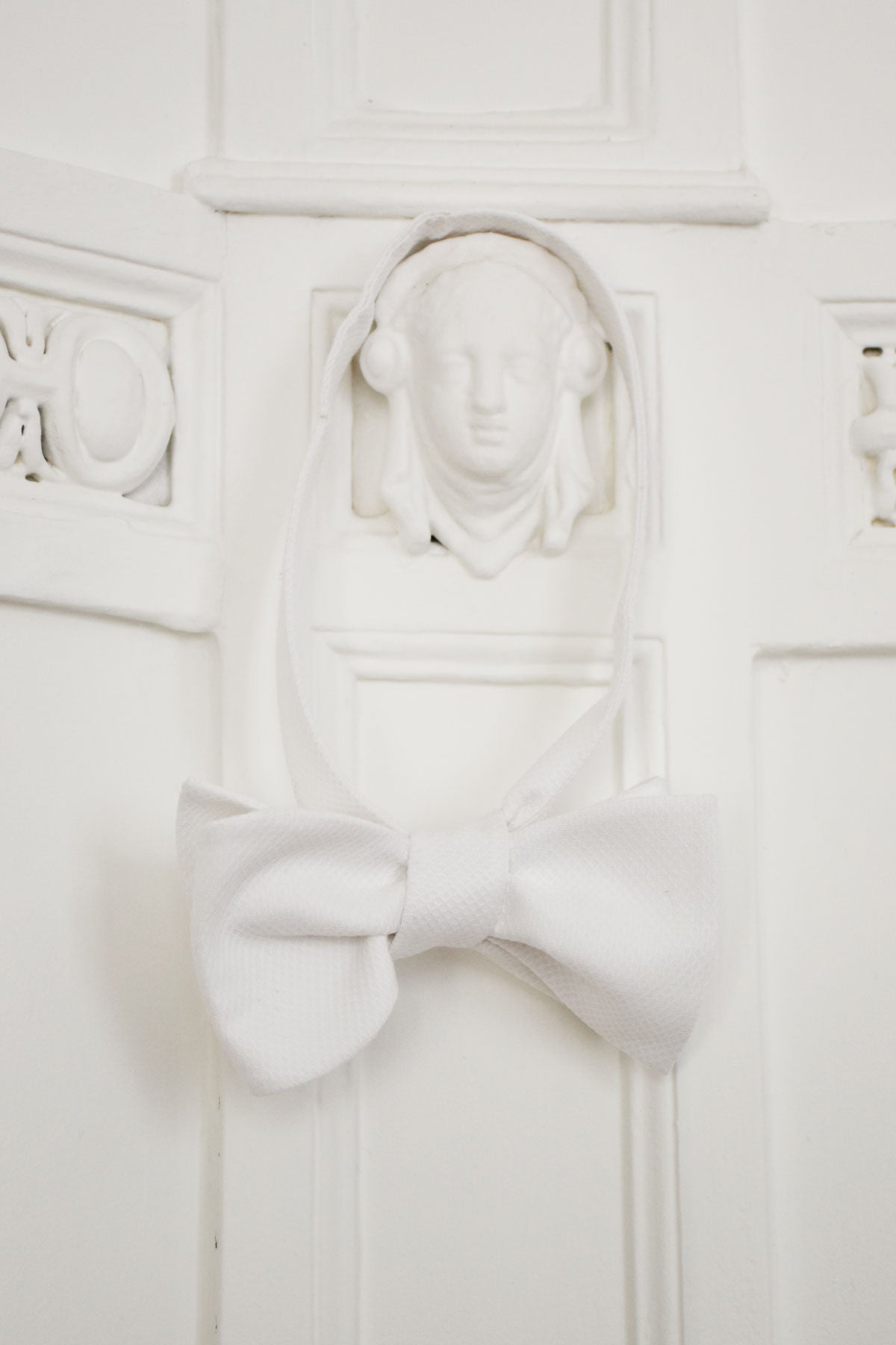 The outfit is completed by a white bow tie, which can be made from the same white pique or Marcella cotton fabric as the waistcoat, or from white silk.