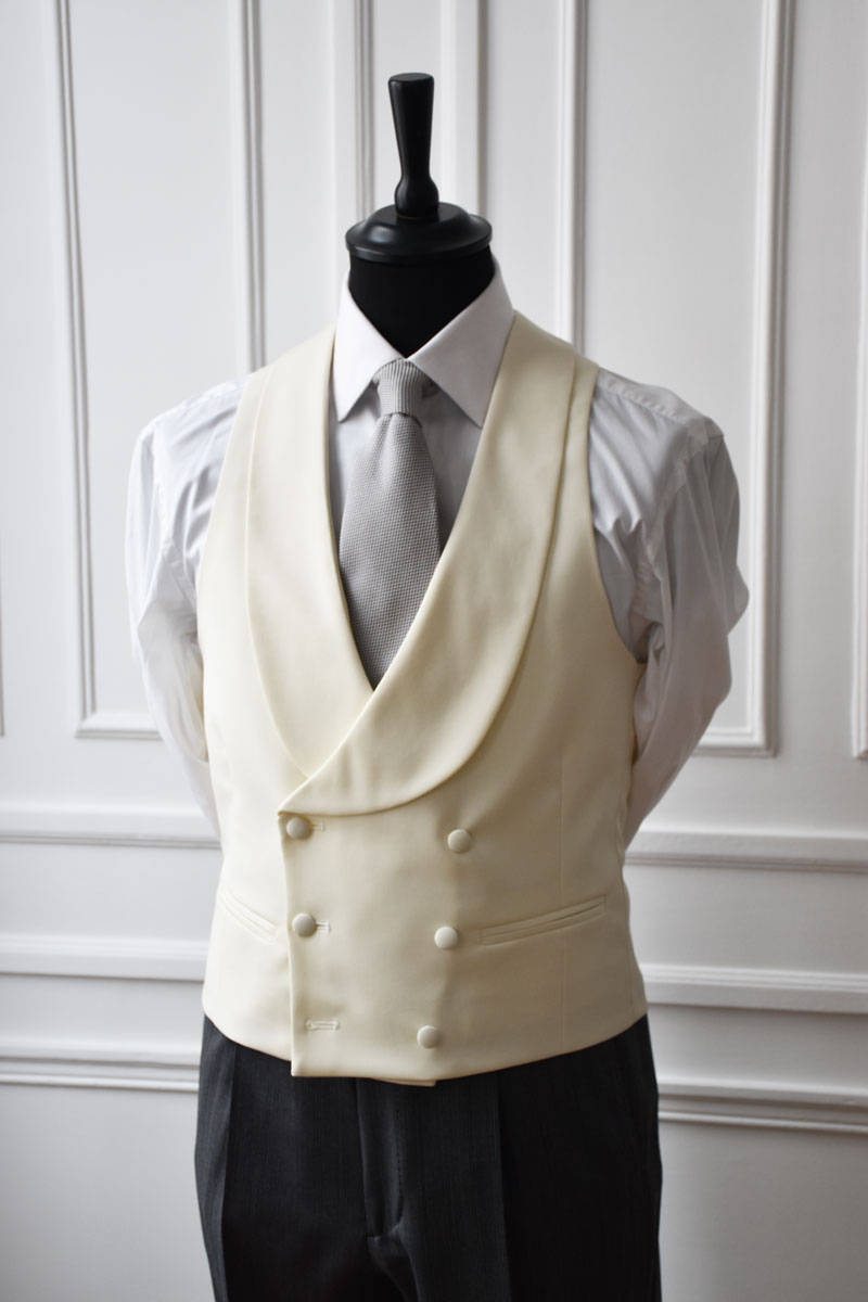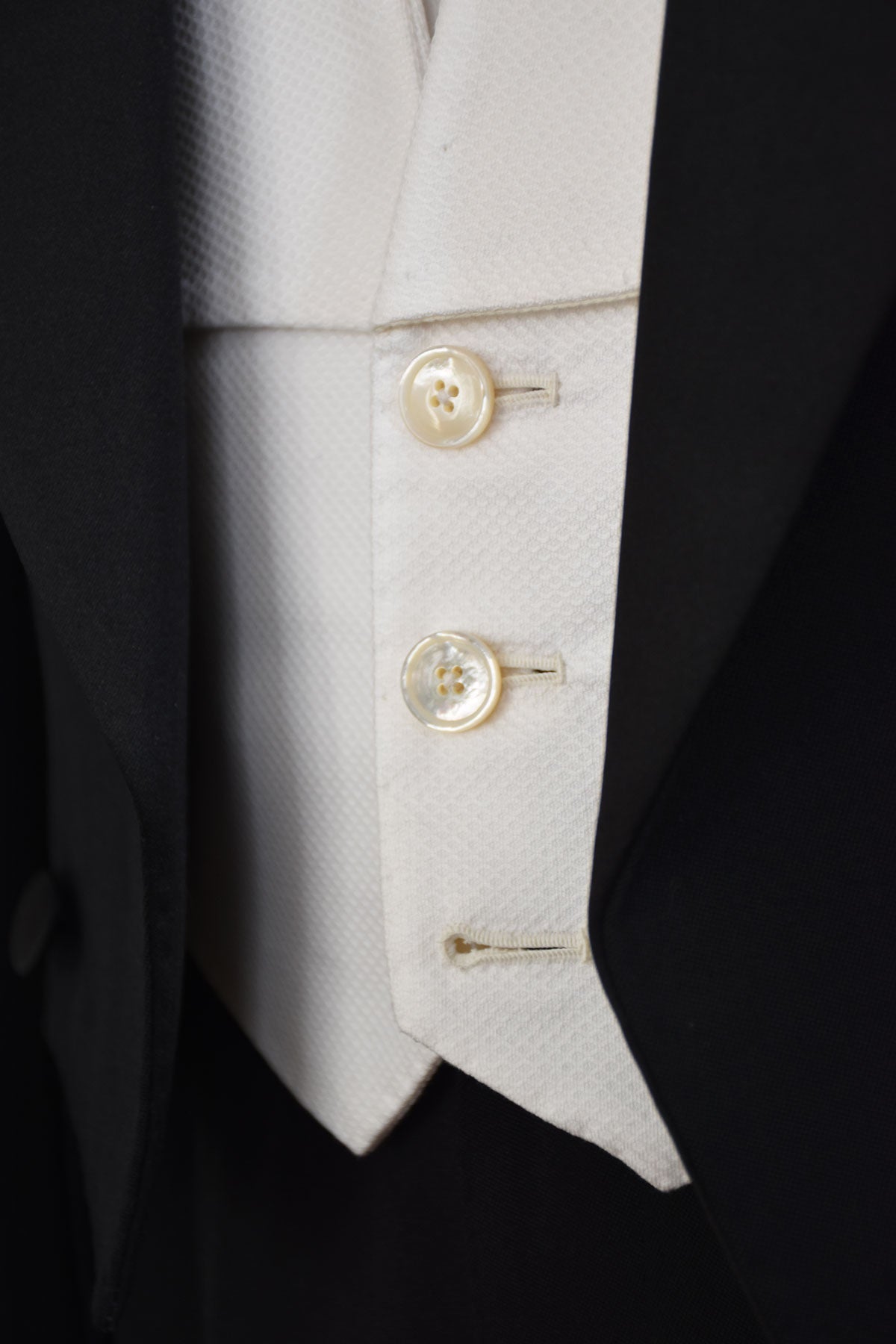 The waistcoat must be white, in "Marcella" honeycomb pique cotton. With a very specific cut, it cannot be used in any other outfit than a tailcoat. The shirt must have a wing collar, a pleated bib, and double cuffs.