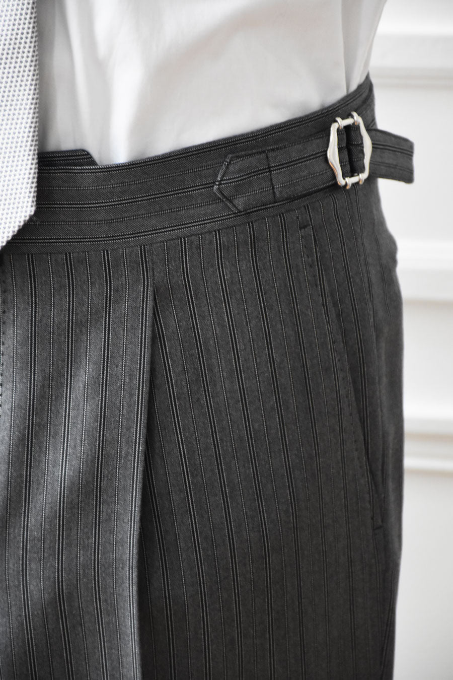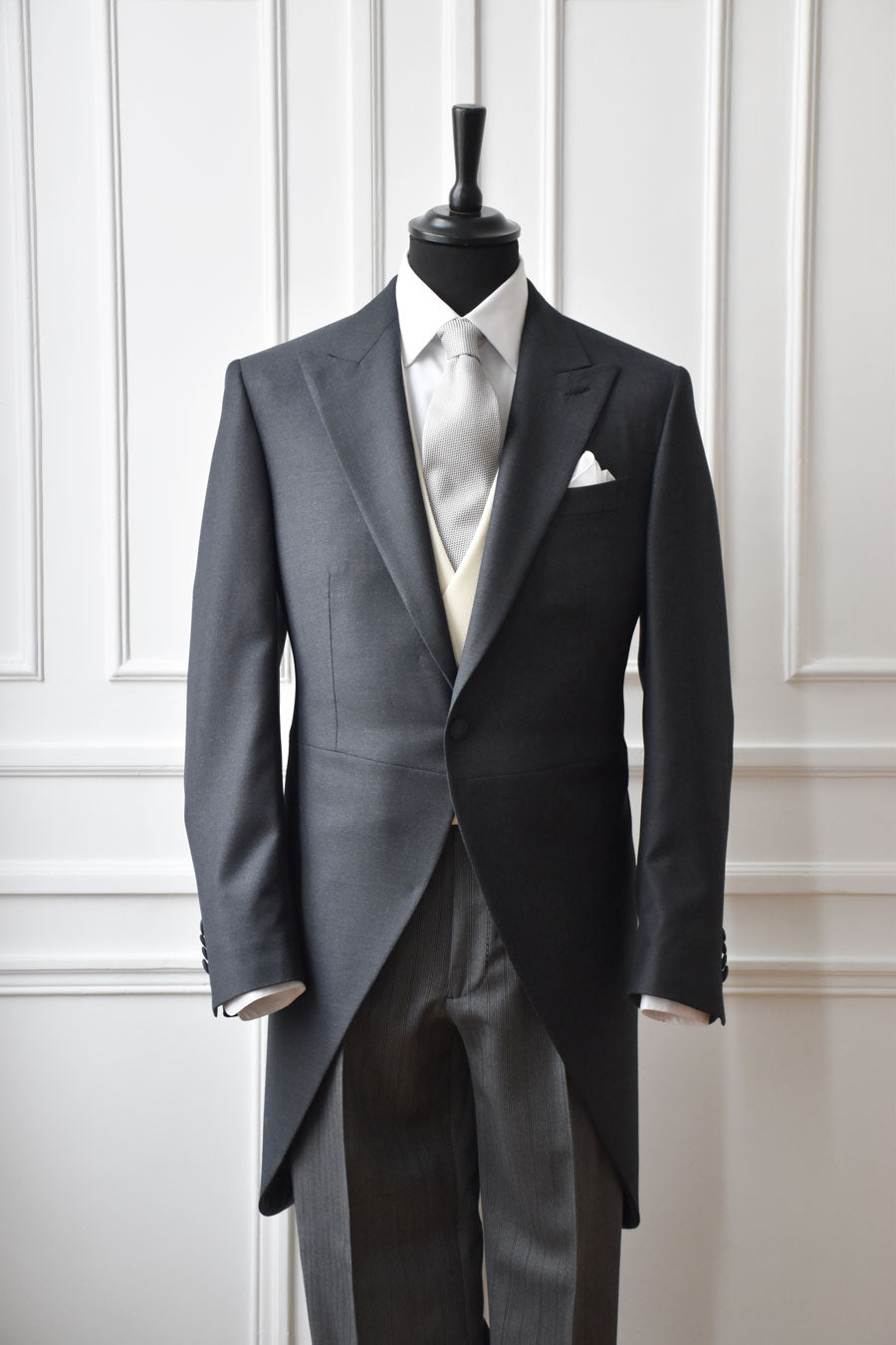 The morning suit is a highly codified garment and will necessarily be worn as a three-piece suit. Generally, the trousers will be charcoal grey with stripes (cashmere stripes) and the jacket black or very dark grey in a rather smooth fabric such as a twill wool. The waistcoat should be in a lighter shade and create a strong contrast.