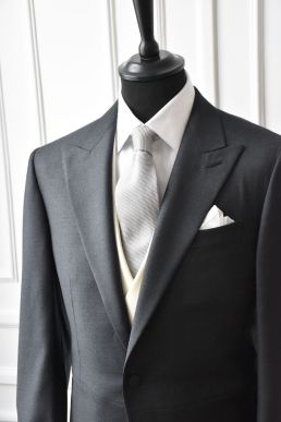 La jaquette est un vêtement très codifié et se portera forcément en trois pièces. Généralement le pantalon sera gris anthracite à rayures et la veste noire ou gris très foncé dans un tissu plutôt lisse comme une laine sergée. Nous avons un large choix de rayures, des plus fines comme des plus larges. Le gilet va surtout dépendre de l’événement et il pourra donc totalement être écru, jaune, bleu ciel ou même rose pâle pour un mariage estival. Vous êtes assez libre dans le choix du gilet, tant qu’il contraste bien avec la veste. La veste sera nécessairement avec des revers en pointe, sans poches côtés, et à un bouton. Le pantalon sera avec ou sans pinces, avec ou sans revers. Le gilet sera droit ou croisé, avec ou sans revers.